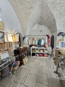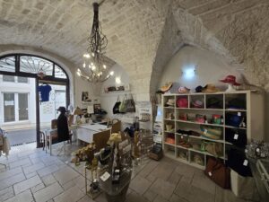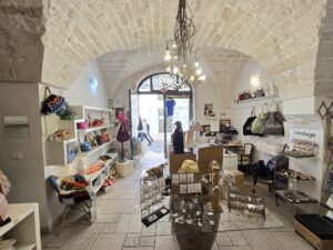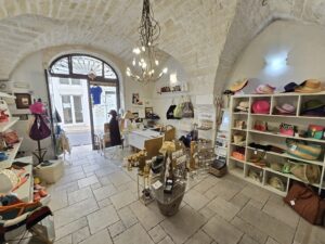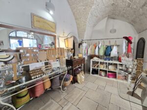 Tra i prodotti in vendita vi sono oggetti realizzati artigianalmente con recupero di antichi tessuti come borse di vario genere per uomo e donna, cappelli, foulard, insieme a vari prodotti di design italiani ed esteri.