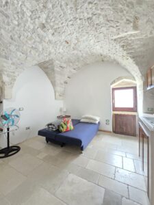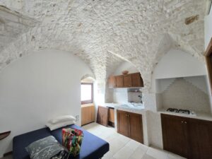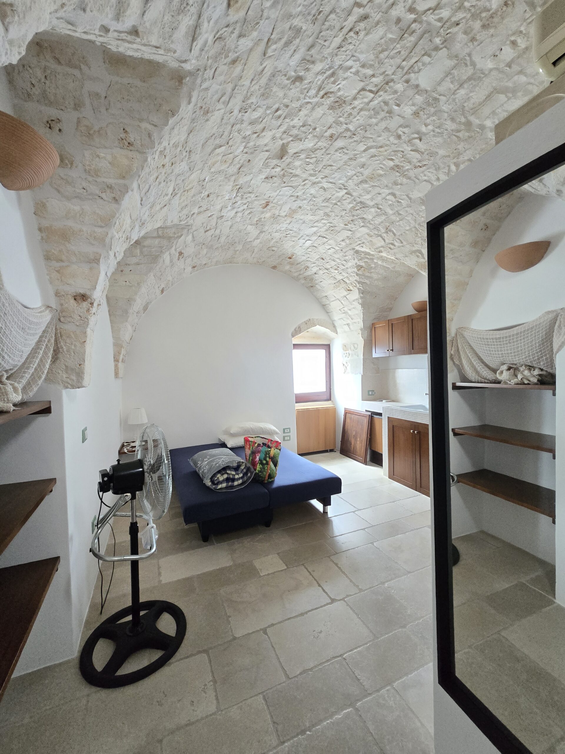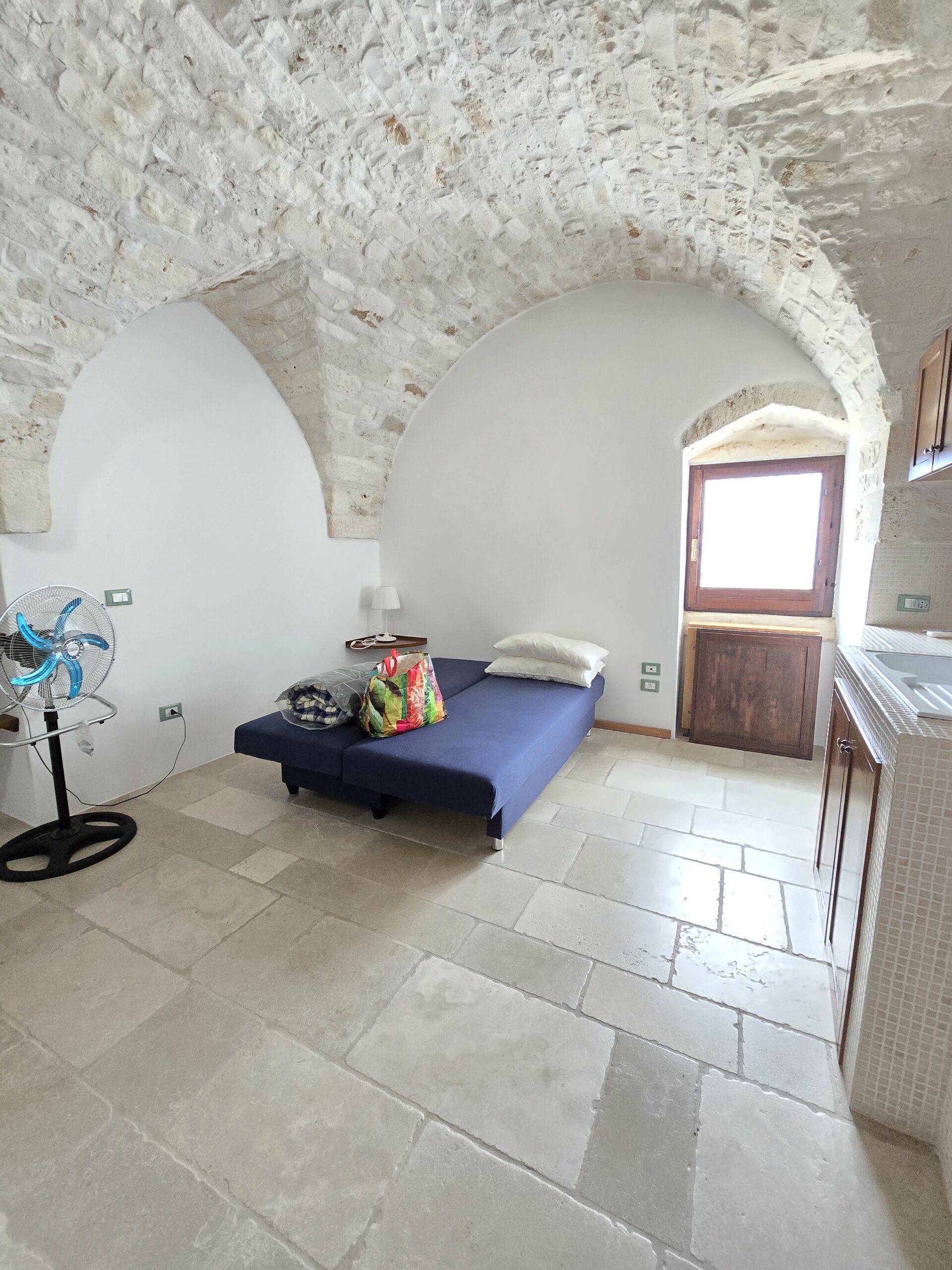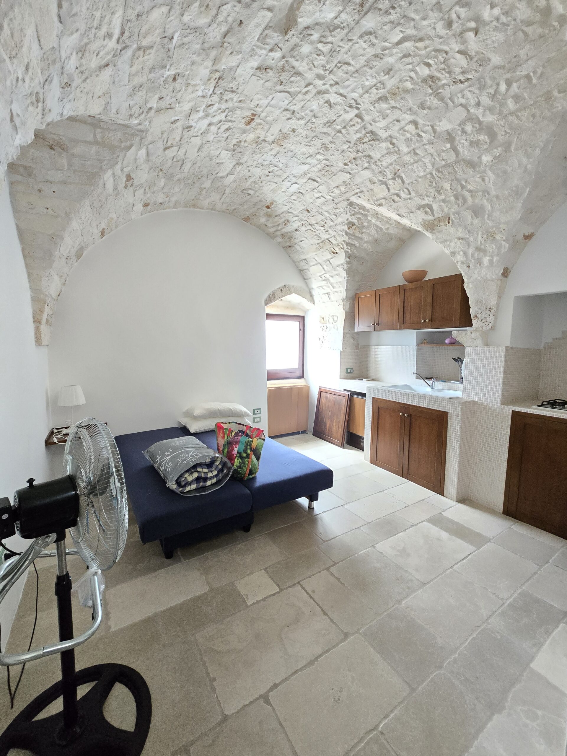 L'abitazione e' posta al primo piano, completamente ristrutturata, dispone di 30 mq ed e' composta da un unico vano dove vi e' una sala con letto ed angolo cottura realizzato in muratura, un piccolo bagno con doccia e un bel terrazzo panoramico da cui si gode di una meravigliosa vista sulla piana degli ulivi secolari e sul mare Adriatico.