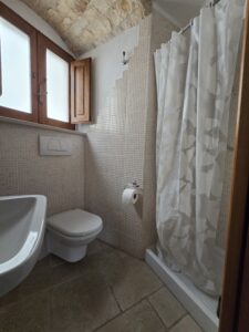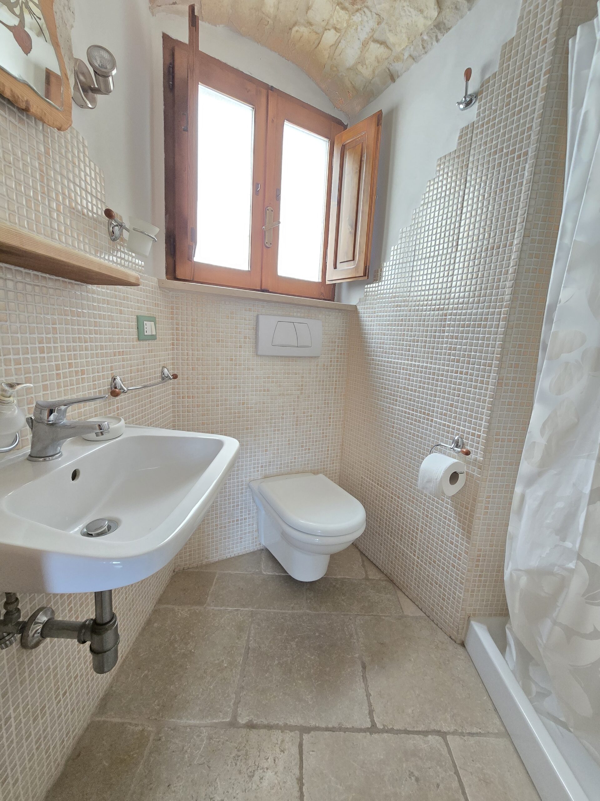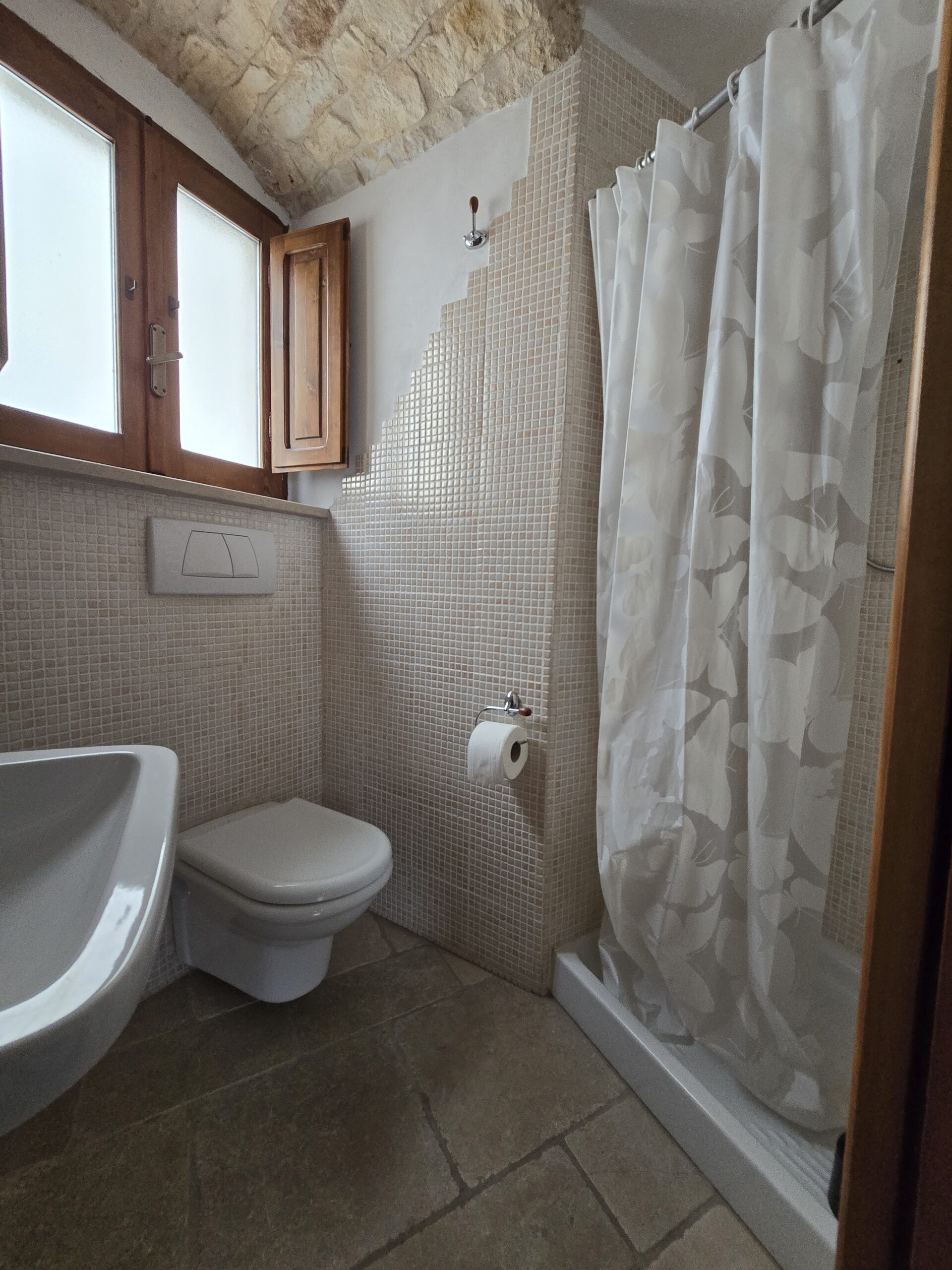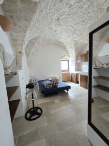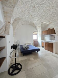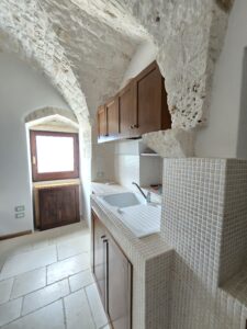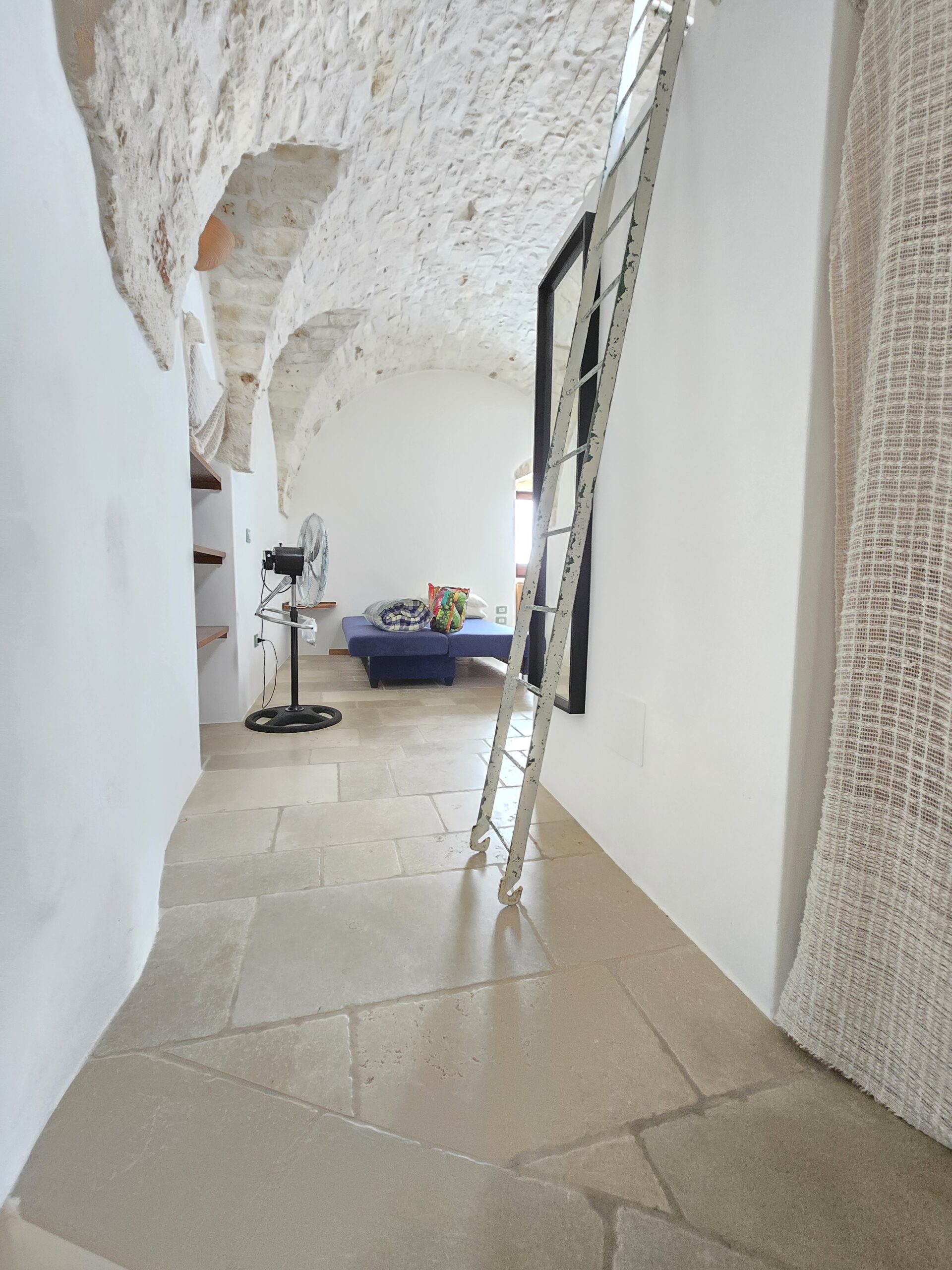 L'abitazione e' posta al primo piano, completamente ristrutturata, dispone di 30 mq ed e' composta da un unico vano dove vi e' una sala con letto ed angolo cottura realizzato in muratura, un piccolo bagno con doccia e un bel terrazzo panoramico da cui si gode di una meravigliosa vista sulla piana degli ulivi secolari e sul mare Adriatico.