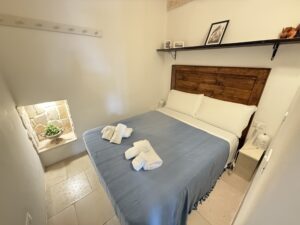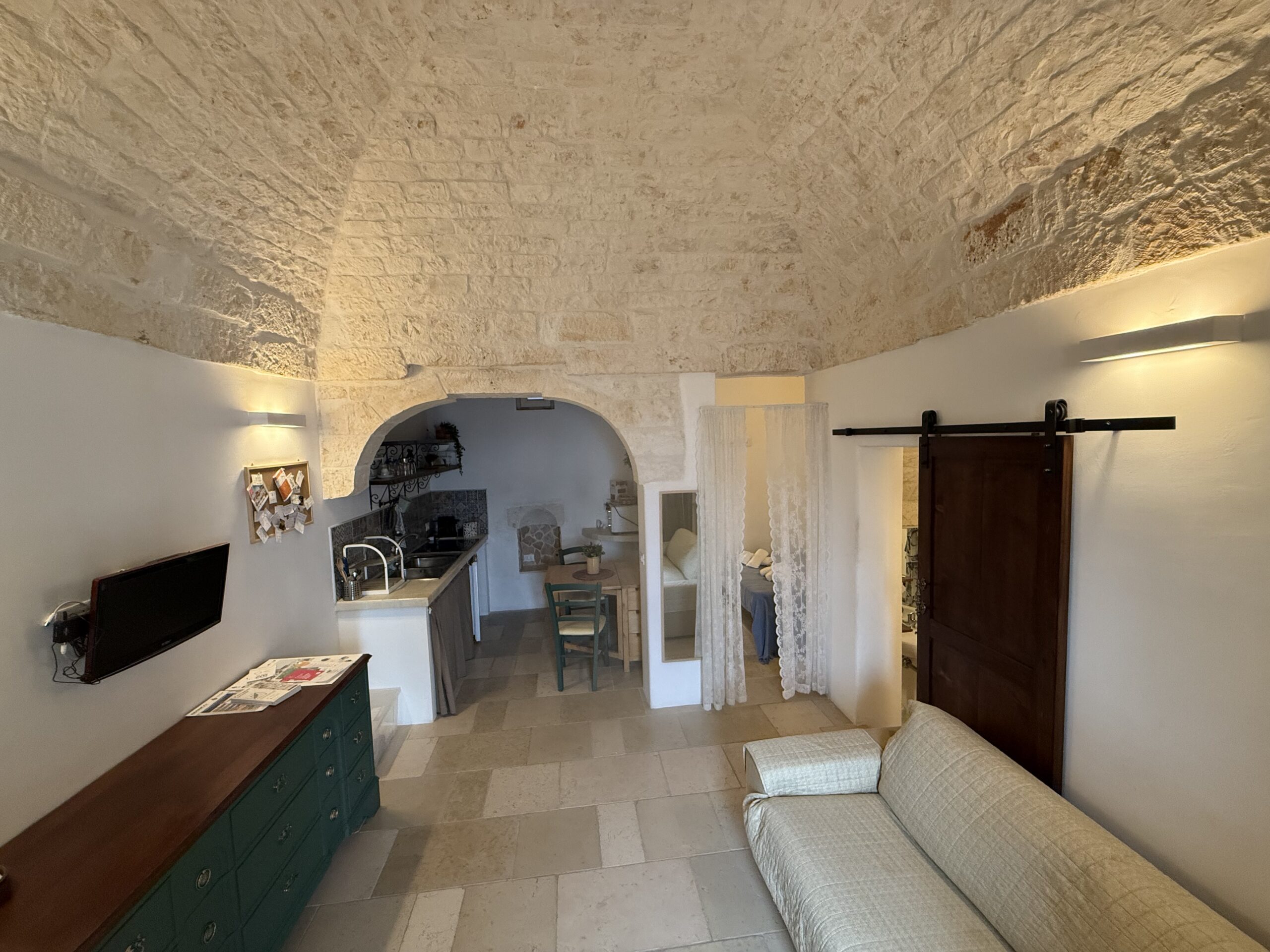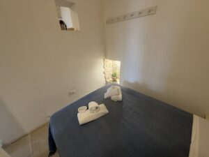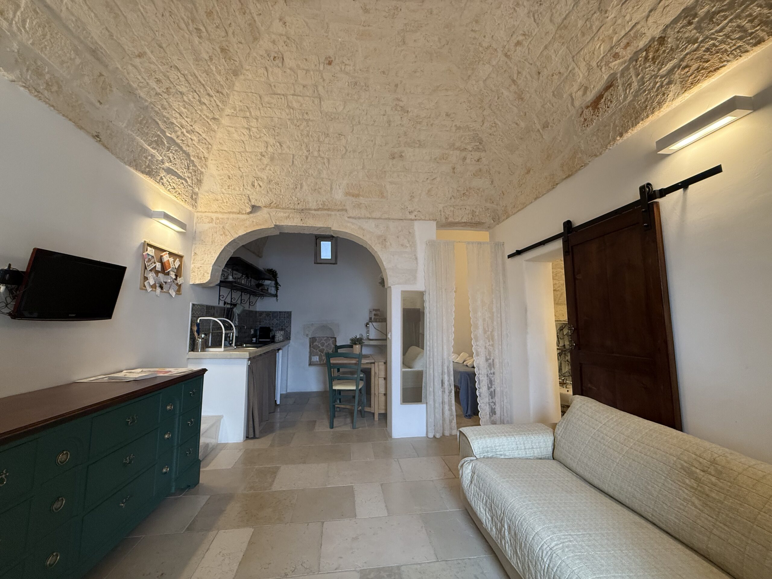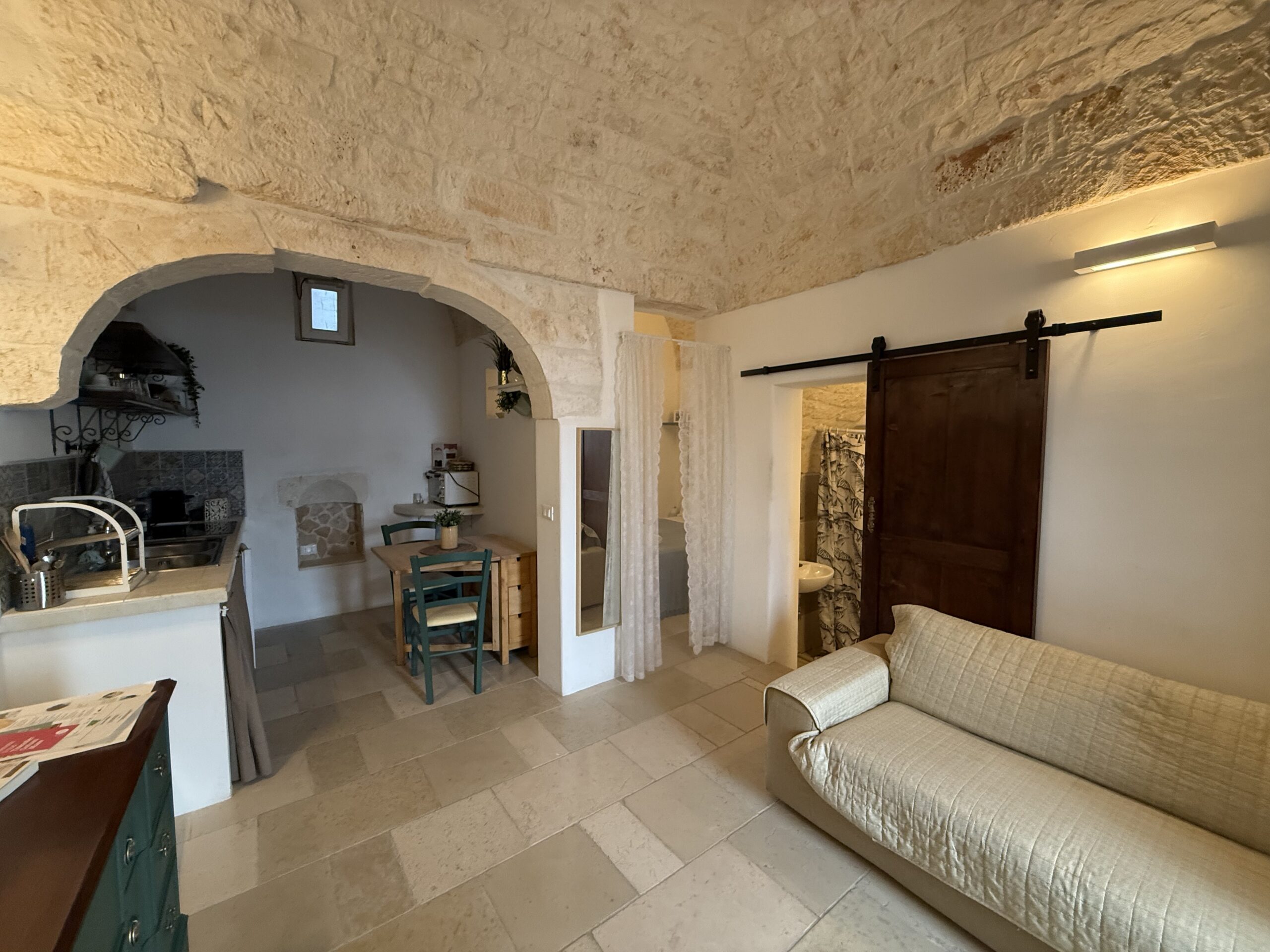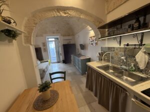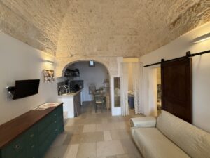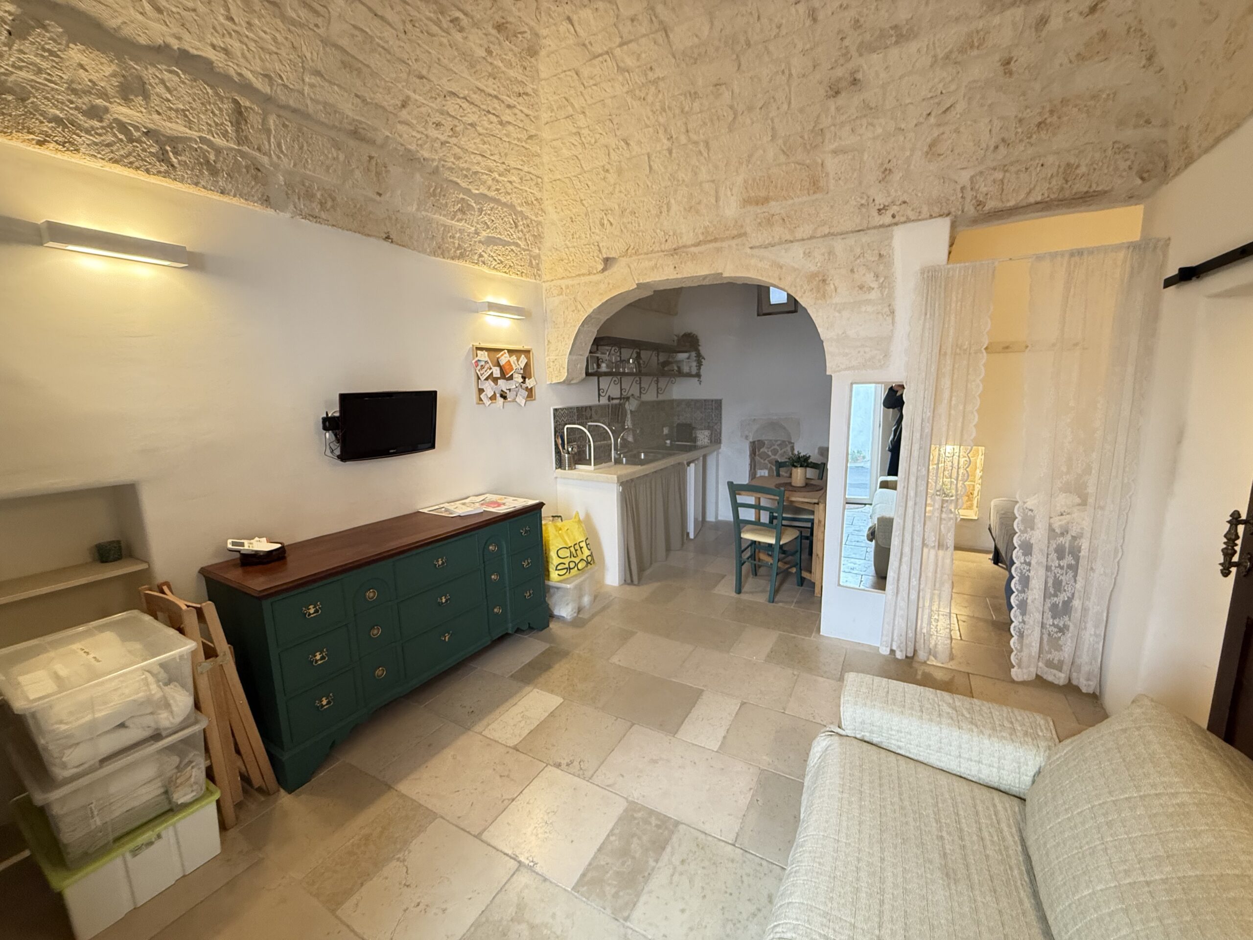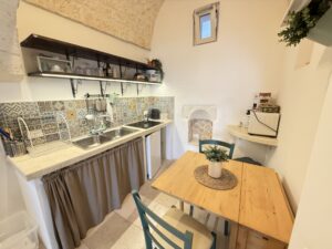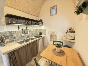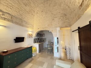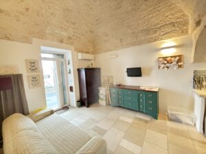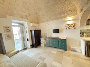 L’abitazione, di circa 35 mq, è composta da una sala con suggestive volte in pietra a faccia vista, un’alcova in cui è stato realizzato un pratico cucinino, una piccola camera da letto e un bagno con doccia. L’immobile è dotato di condizionatore, predisposizione per il riscaldamento e vespaio.
