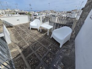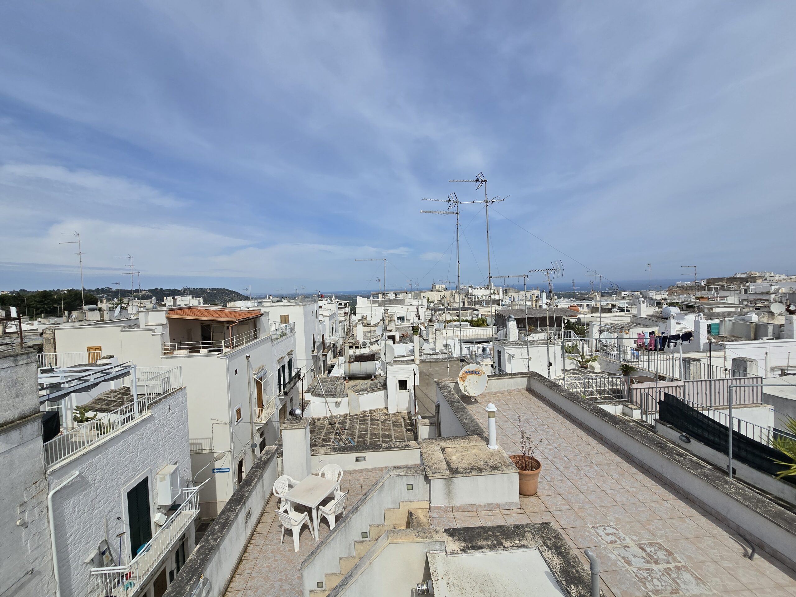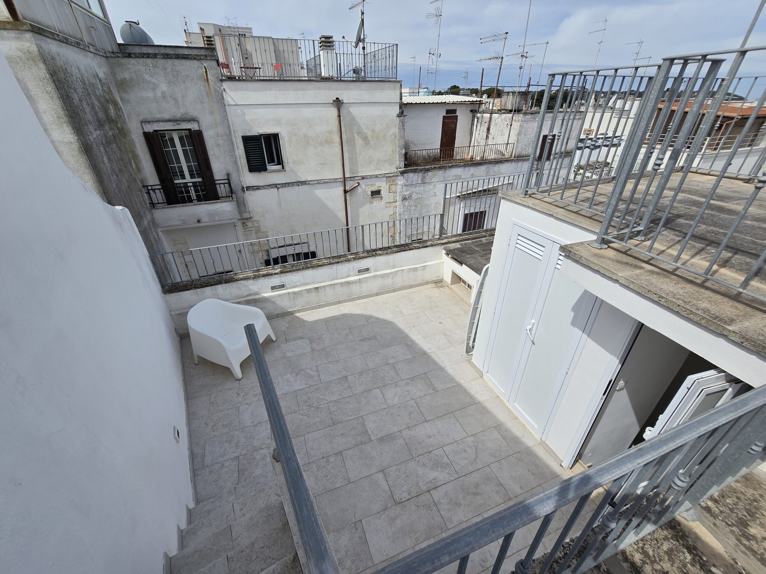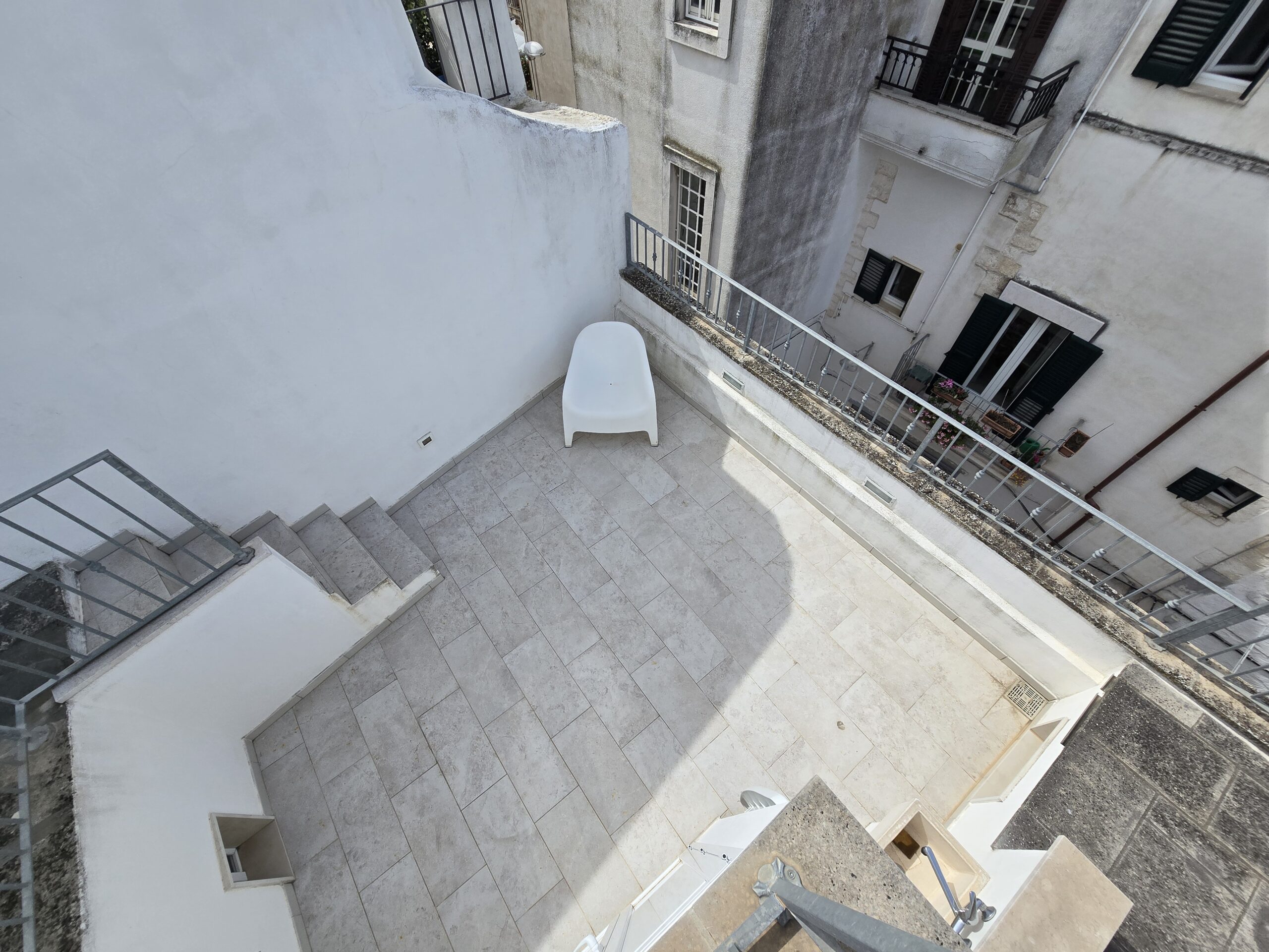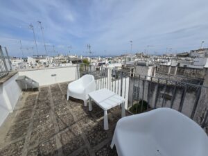 Dispone di un bel terrazzo che si sviluppa su 3 livelli differenti da dove si gode un bel panorama sulla Marina di Ostuni ed il Centro Storico.