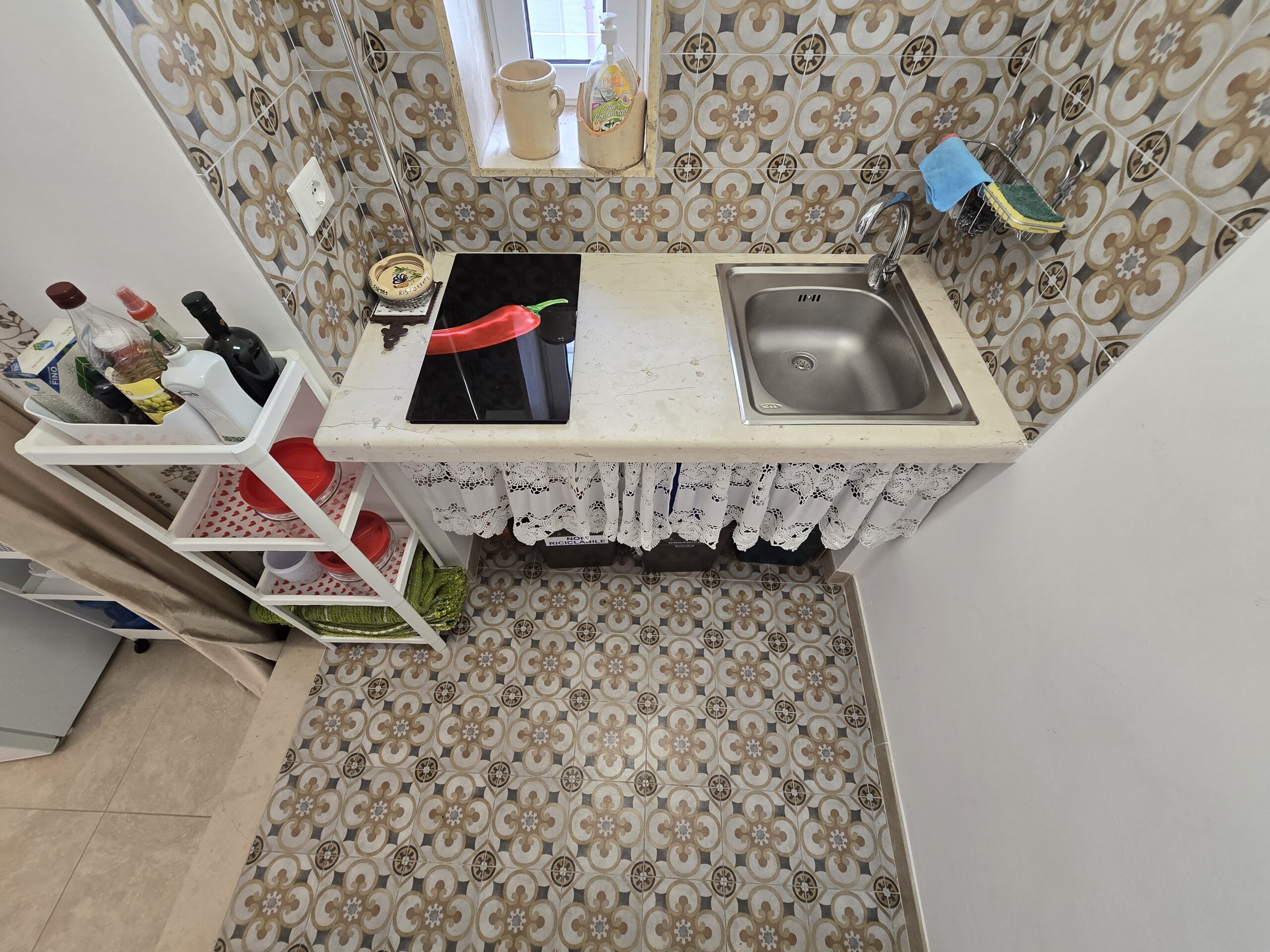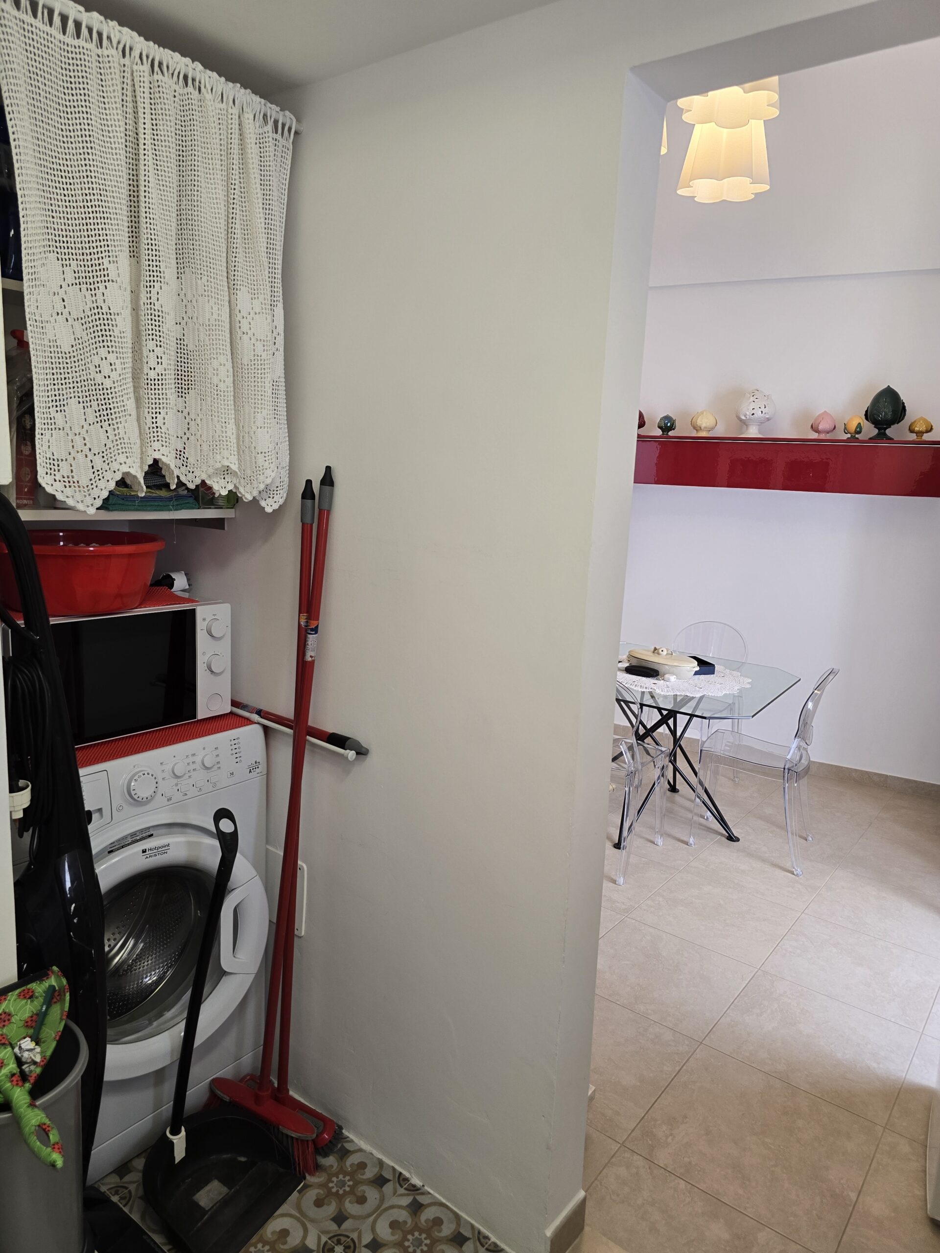 L'abitazione di 60 mq al primo piano e' composta da una bella slaa con alcova letto, un bel bagno completo con doccia , con termoarredo elettricoe finestrato, un angolo cottura ben attrezzato con piano cottura ad induzione ed un bel balcone grande.