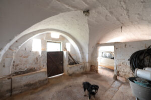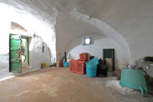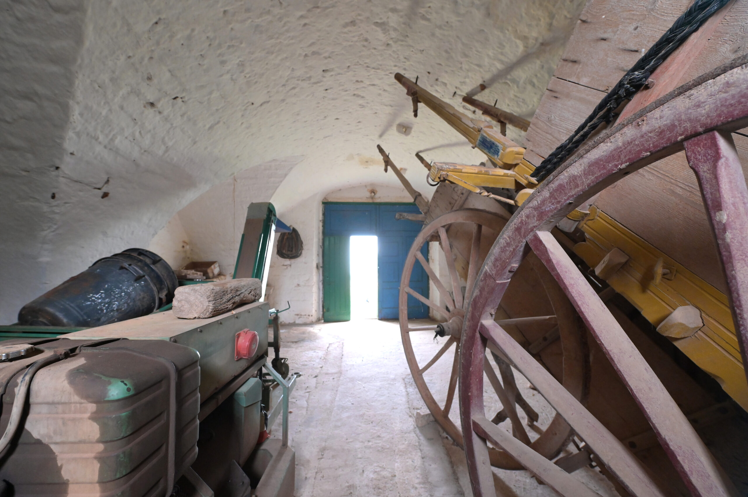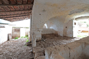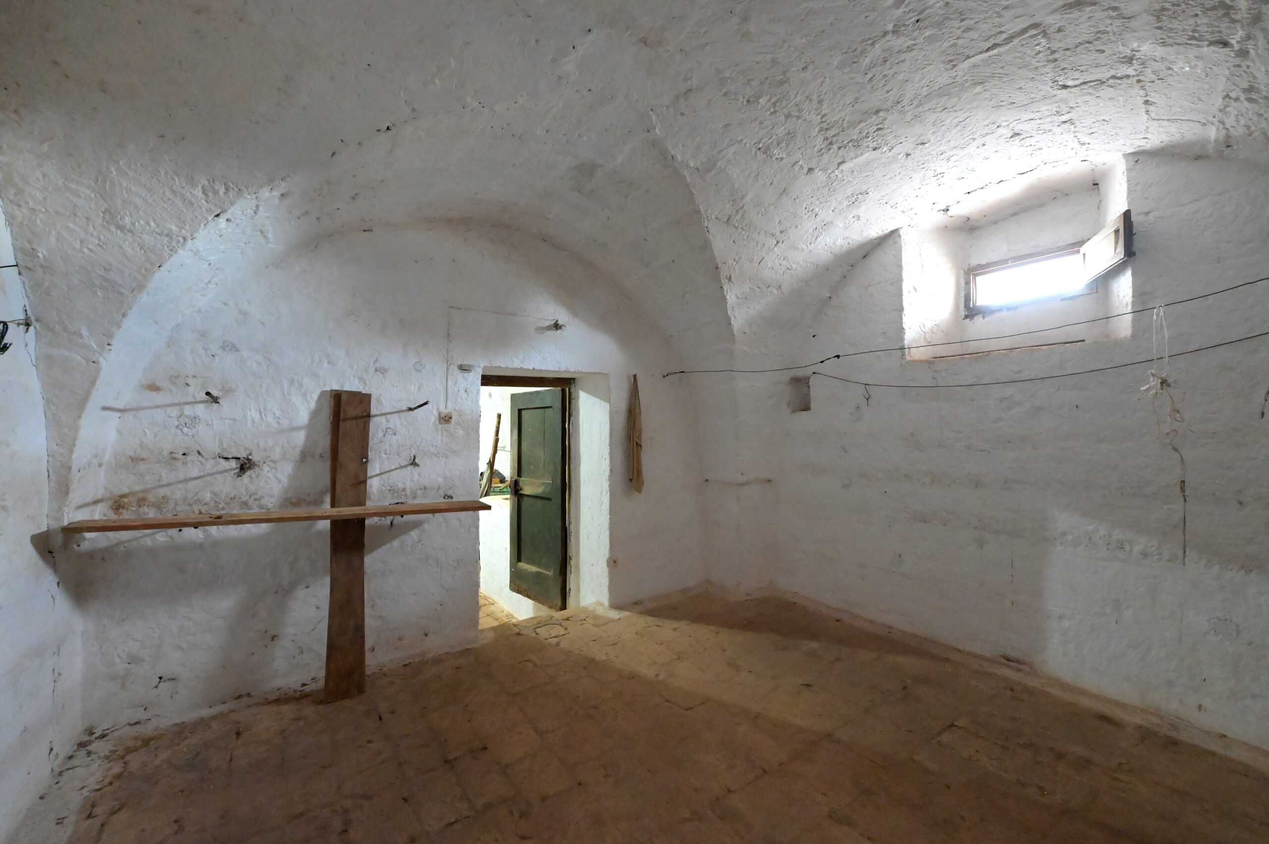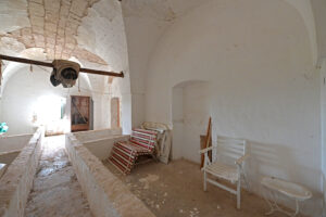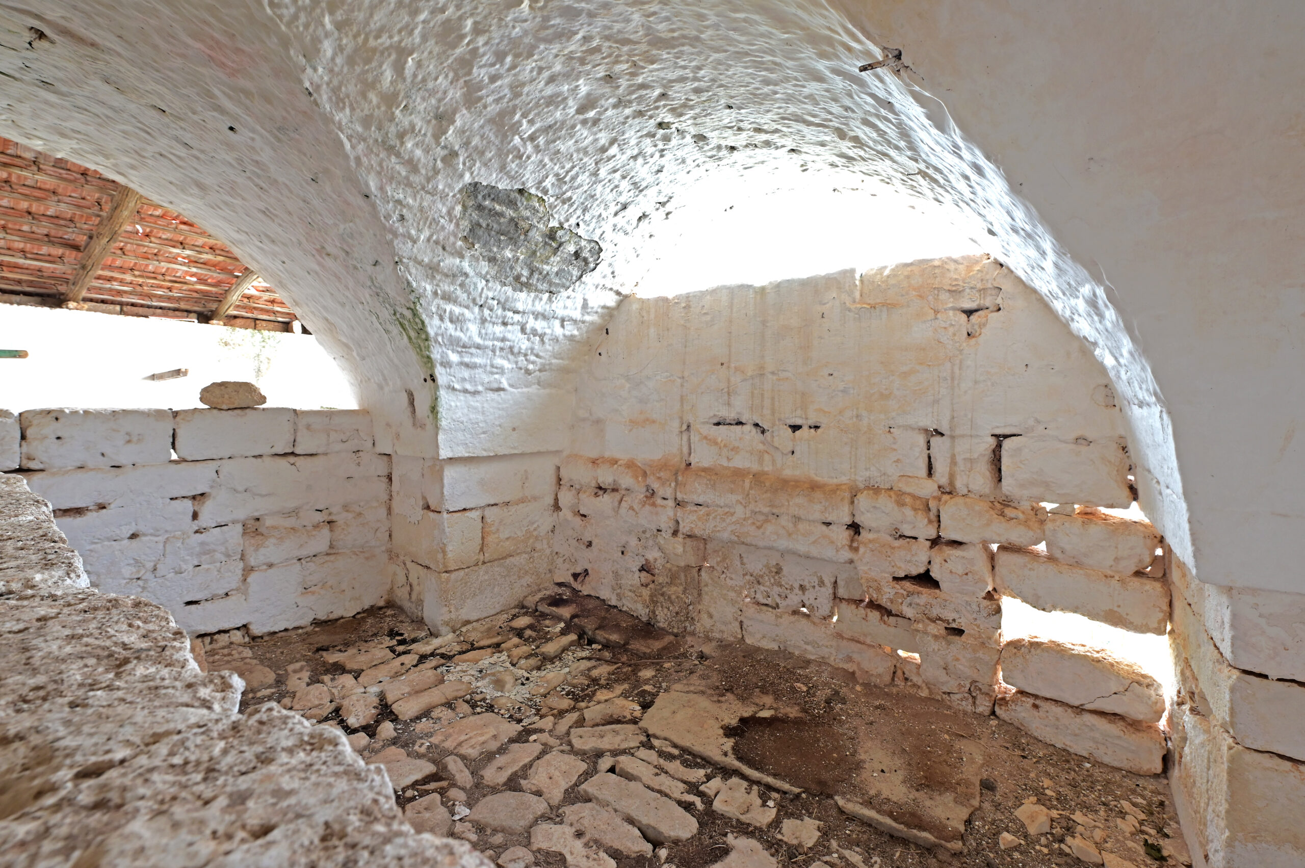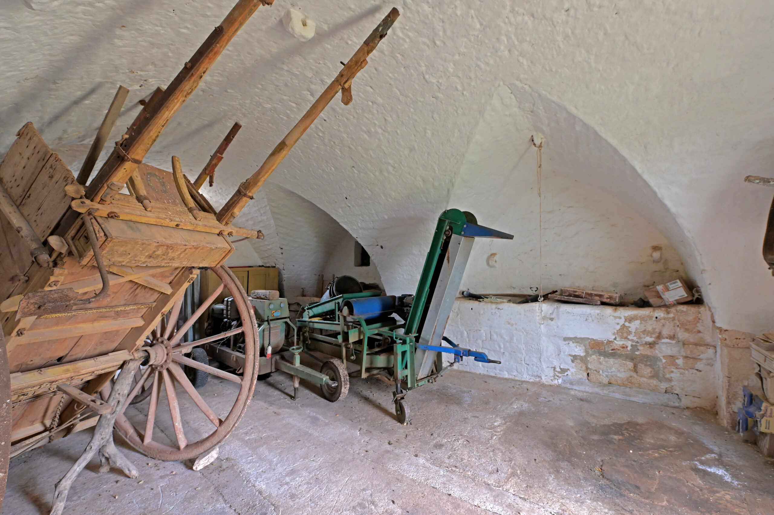La masseria prevalentemente costituita da tufo e in piccola parte da pietra calcarea che ha come caratteristica principale la modalita' tipica del luogo che ha nelle volte a stella, a botte e a padiglione, il pregio principale.