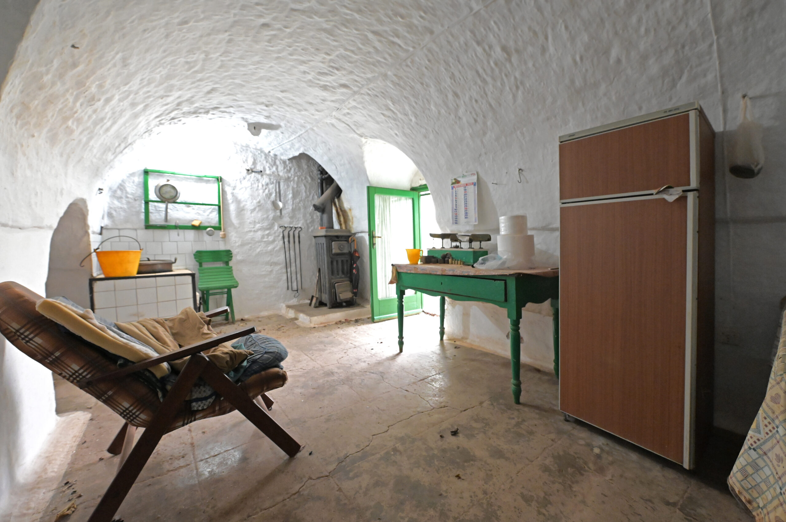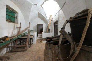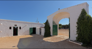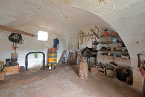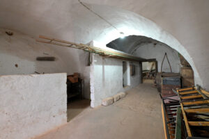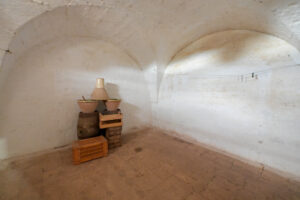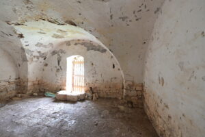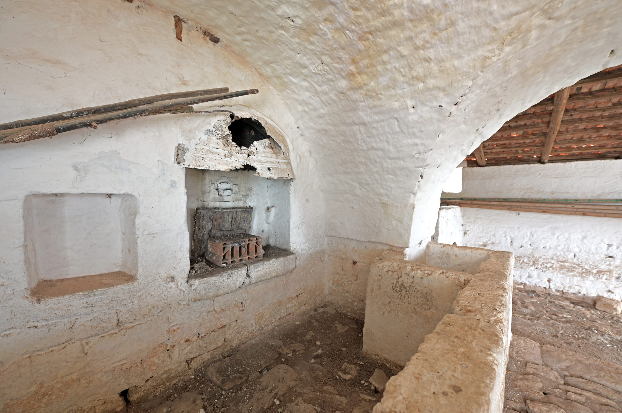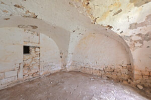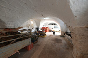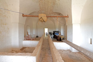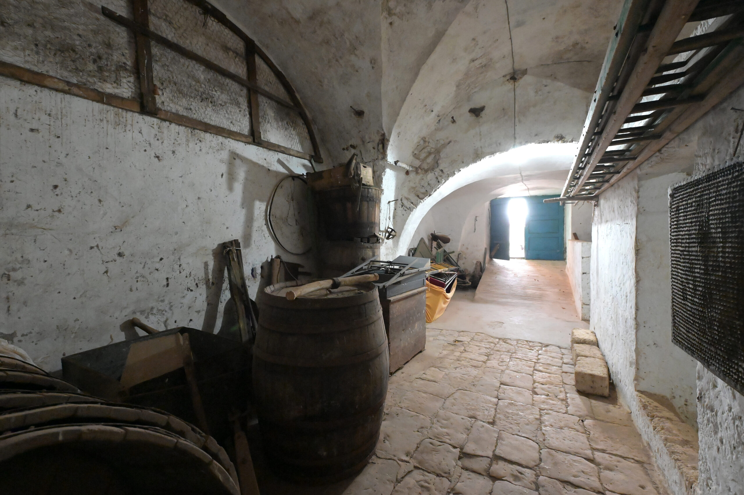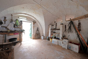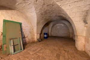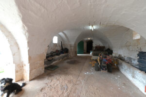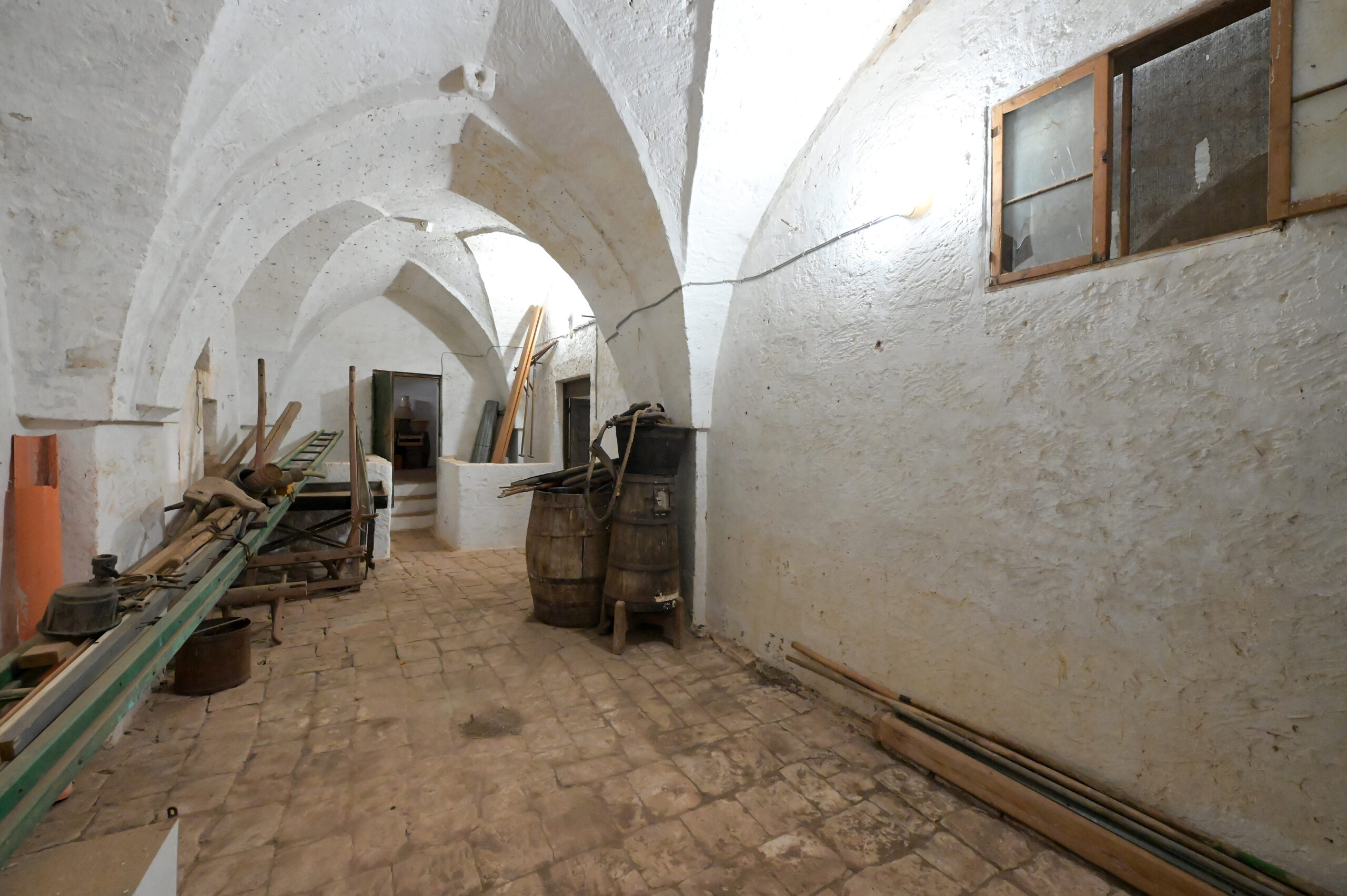 La masseria prevalentemente costituita da tufo e in piccola parte da pietra calcarea che ha come caratteristica principale la modalita' tipica del luogo che ha nelle volte a stella, a botte e a padiglione, il pregio principale.