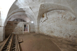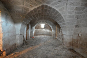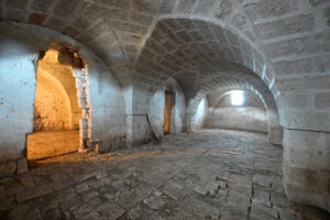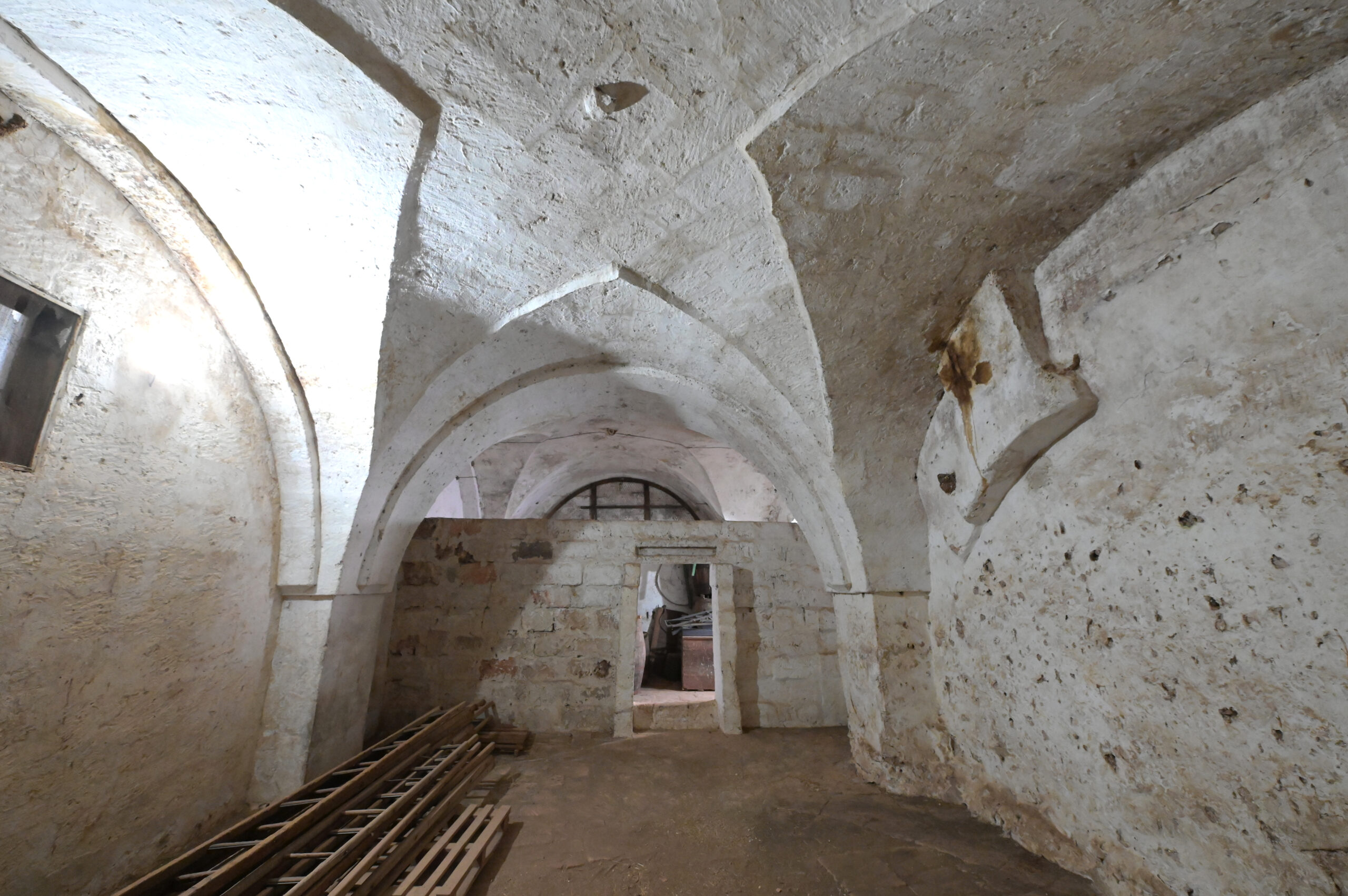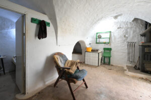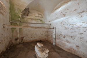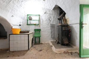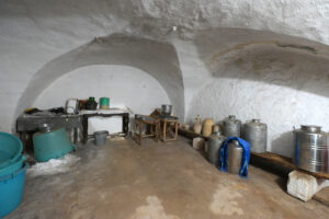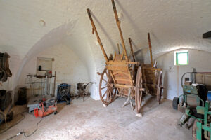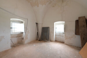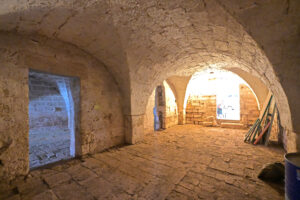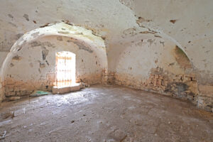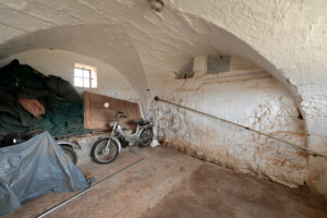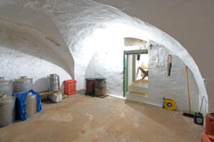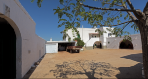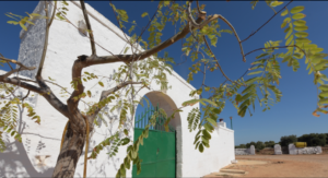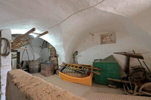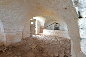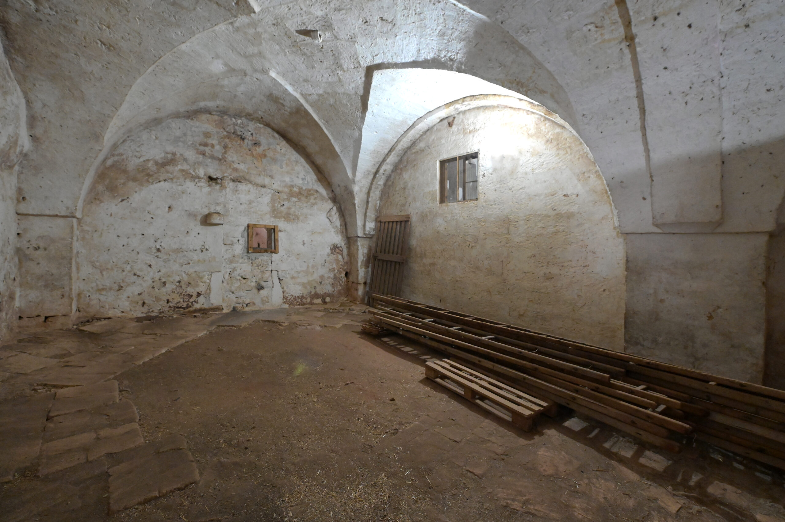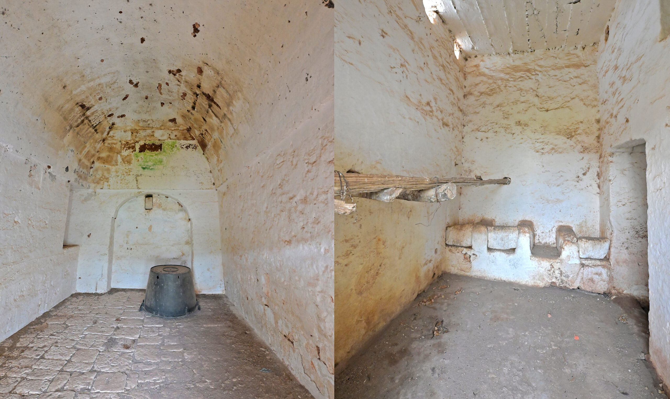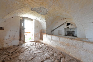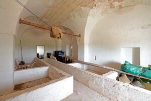 La masseria prevalentemente costituita da tufo e in piccola parte da pietra calcarea che ha come caratteristica principale la modalita' tipica del luogo che ha nelle volte a stella, a botte e a padiglione, il pregio principale.